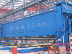 船用三輥對稱式卷板機(jī)結(jié)構(gòu)型式為三輥對稱式,上輥在兩下輥中央對稱位置作垂直升降運(yùn)動,通過液壓缸內(nèi)的液壓油作用于活塞桿而獲得,為液壓傳動;通過特殊設(shè)計(jì)減速機(jī)分別帶動全滾動軸承的兩下輥?zhàn)餍D(zhuǎn)運(yùn)動,為卷制板材提供扭矩;在下輥下部設(shè)有多組托輥,以提高下輥的剛度,并可進(jìn)行垂直調(diào)節(jié);在上輥的上部設(shè)有剛性大梁,在大梁與上輥之間設(shè)有多組托輥,以提高上輥的剛度;適用于超寬圓弧形零件的卷制。可卷板厚3mm-50mm,板寬21000mm的板料。